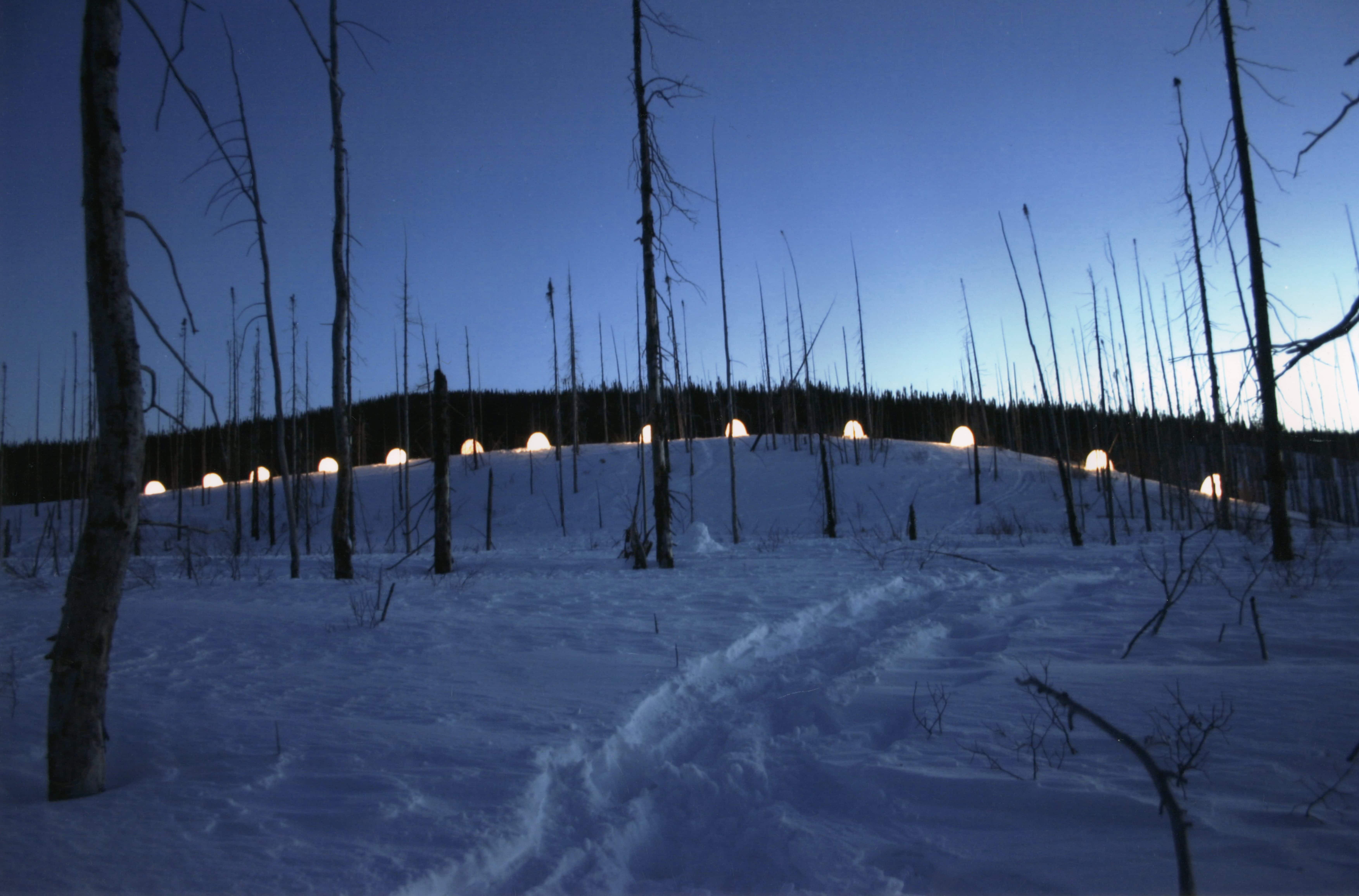 Hundreds of flittering candles trace ephemeral grids or strange constellations on the surfaces of iced lakes at night.
