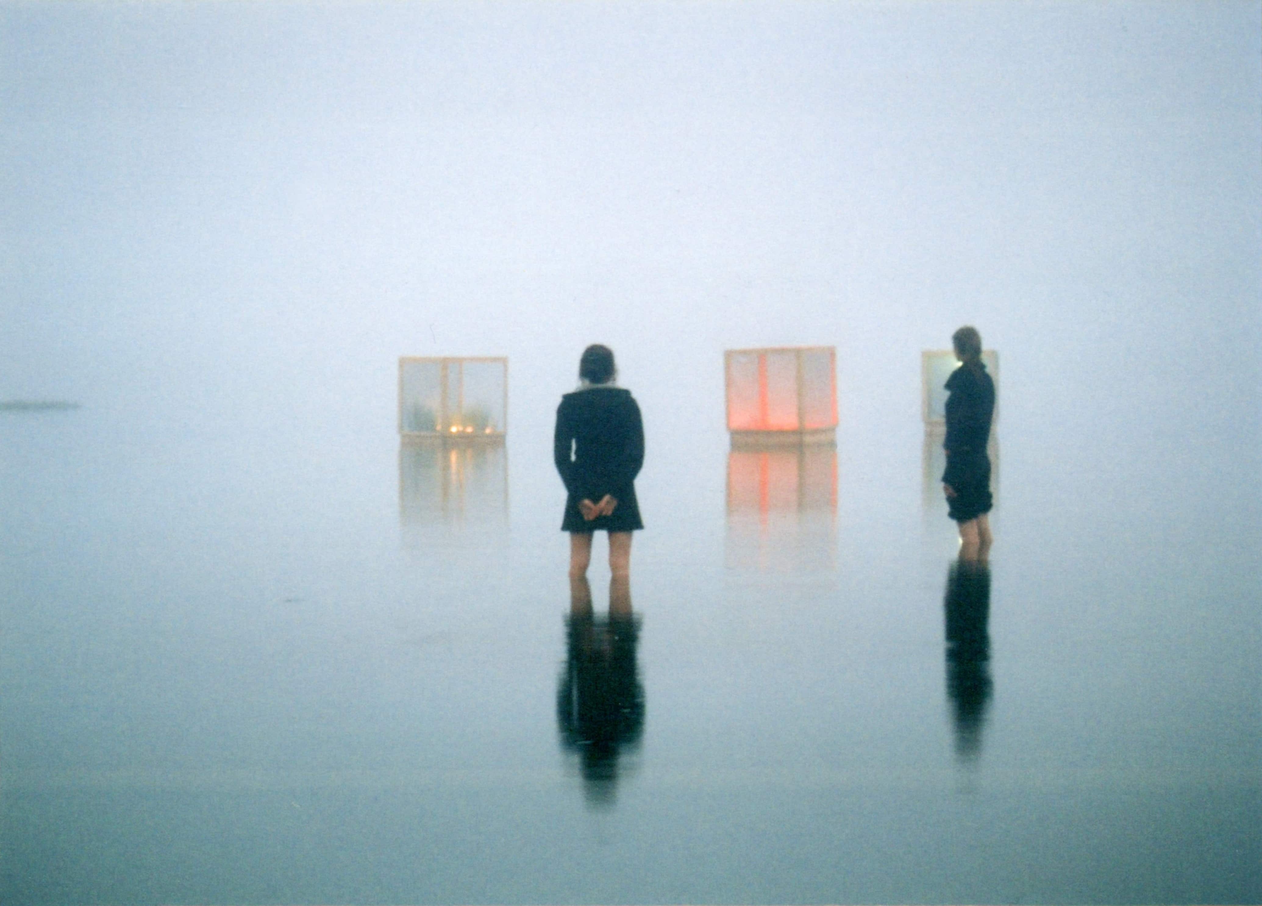 Tiny gardens of stones, grasses, driftwoods or lights are contained in floating cubes mysteriously emerging out of crepuscular mists.